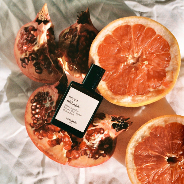 The Accrodisiaque extrait de parfum by Versatile Paris is vegan, alcohol-free, and crafted with 70% plant oils (sweet almond, wheat germ) and 30% perfume concentrate. It offers a smooth, long-lasting diffusion with an intimate, skin-like texture.